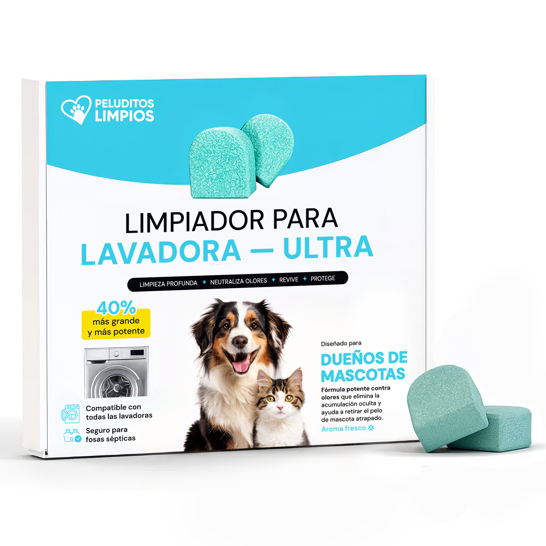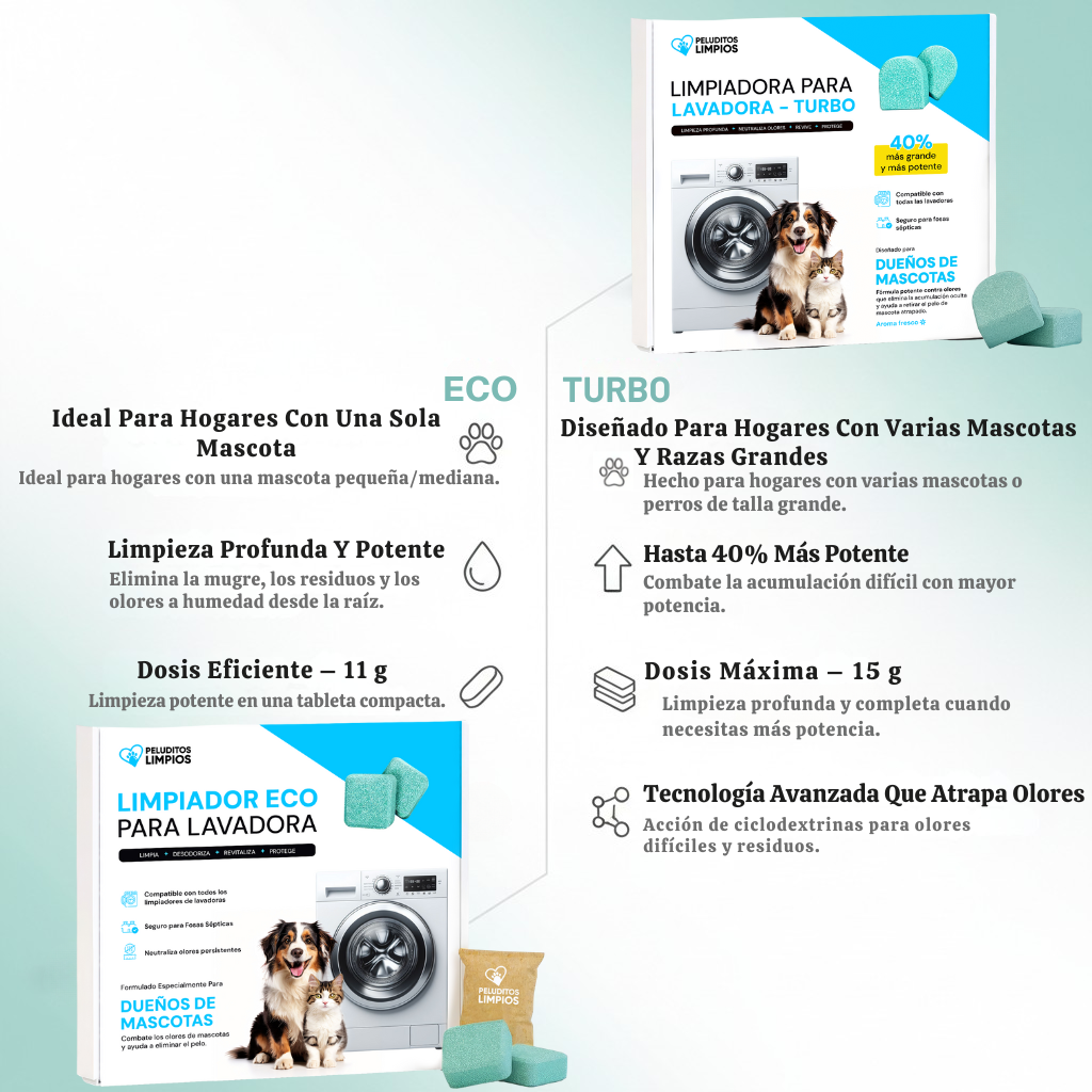 El Peluditos Limpios de lavadoras Turbo es una tableta formulada específicamente para limpiar lavadoras que acumulan pelo de mascota, olor a mascota, residuos de detergente, suavizante y de tela. Además, elimina el 99.9 % de las bacterias y gérmenes que quedan en la máquina después de un ciclo de lavado.