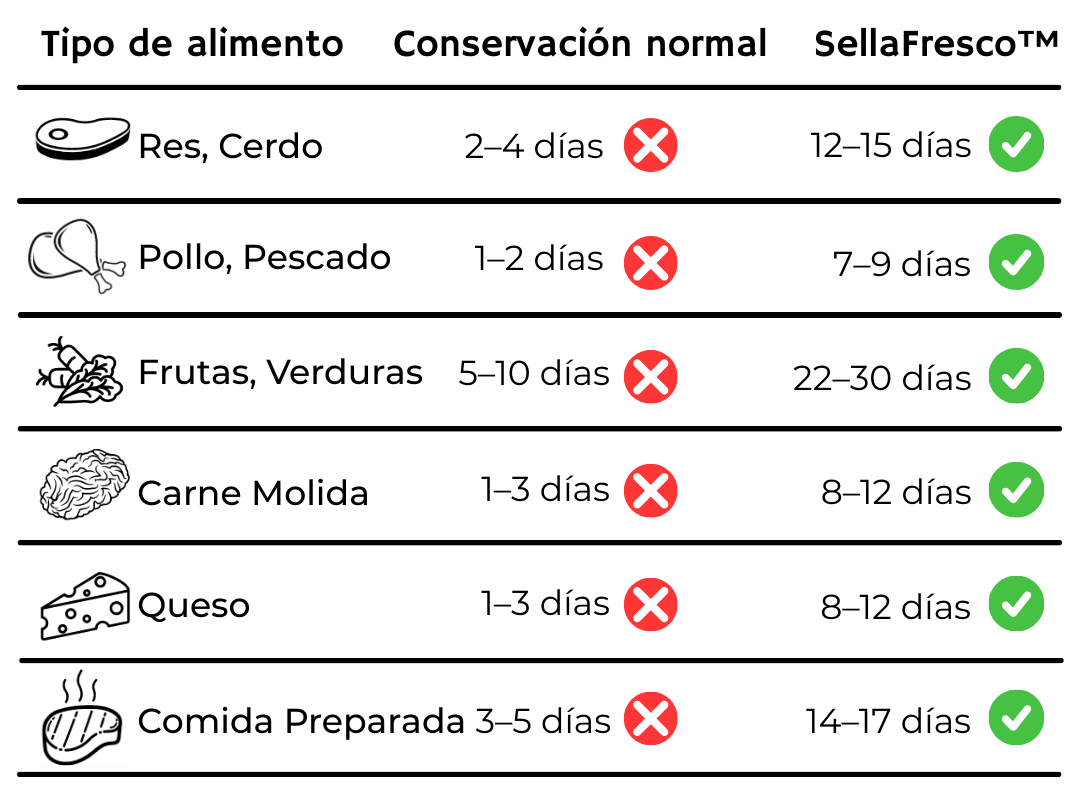Hace 12 meses que uso SellaFresco™ y puedo decirte que ya he ahorrado muchísimo en el súper. De verdad cumple: lo uso casi todos los días. Sello al vacío carnes, frutas y verduras… ya casi no tiro comida.